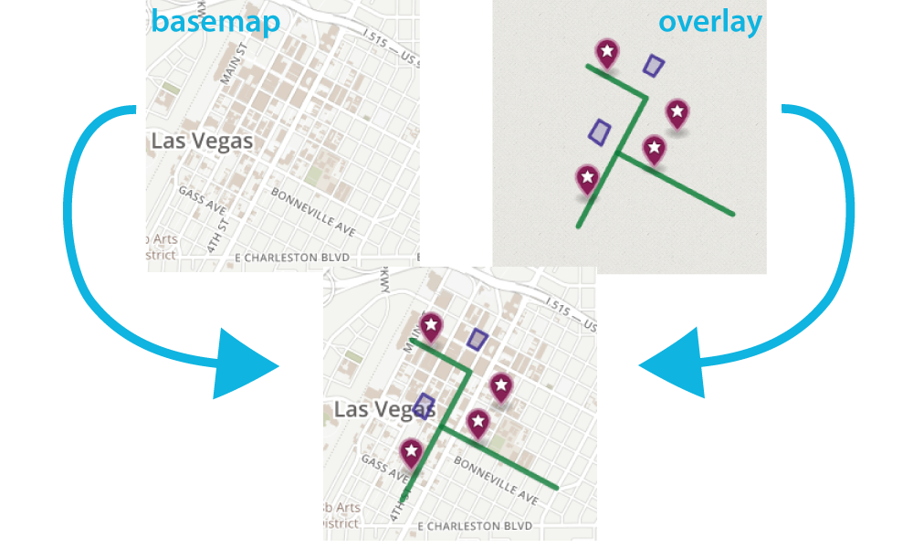 Themes of information overlaid on a basemap that help tell a story - typically vector.