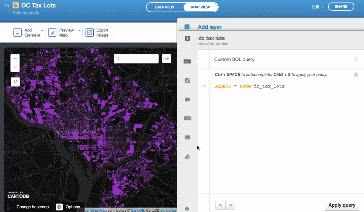 First, navigate back to your dashboard, go to your datasets, and click on dc_tax_lots to directly enter the data table (instead of working on visualizing the data).