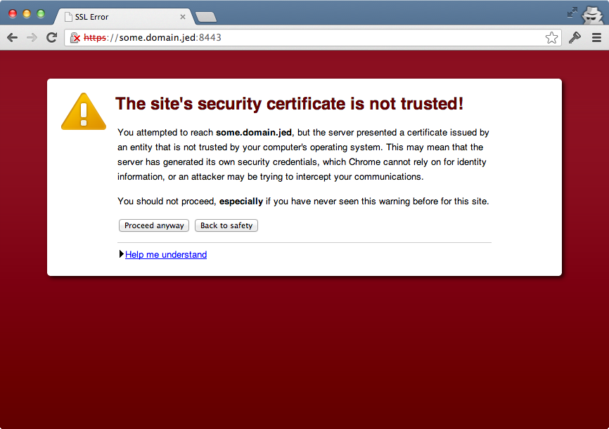 Any content we try to serve over HTTPS from this domain gets IMMA-LET-YOU-FINISHed by a scary message like the one above, warning us that the presented certificate is not trusted. This message differs by browser, and you might be tempted to go ahead and ignore it, but that's not a good habit to get into, and is likely to lead to development complexity down the road.