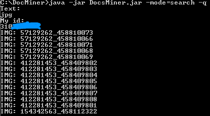 Если все вышло, устраиваем еще одну проверку. На этот раз запускаем DocsMinerSearch. Сначала пишем поисковый запрос, например jpg. Потом свой номер вк.