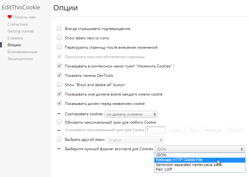 Важно перед этим зайти в настройки и выбрать Netscape HTTP Cookie File.
