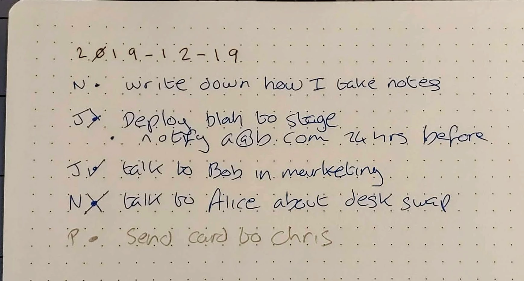 - If the bulleted point is no longer relevant to me, either because someone else has taken care of it, or because it's no longer needed, then an "X" is drawn through the bullet point.