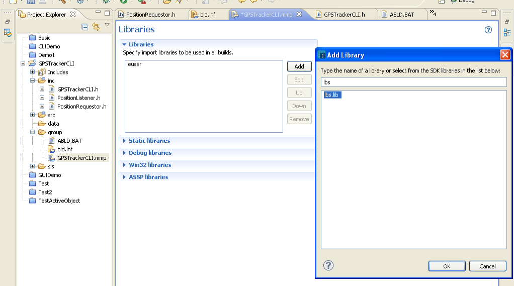 Нужно подключить lib-файл. (В данном случае lbs.lib). Открываем mmp-файл и добавляем библиотеку во вкладке Libraries.