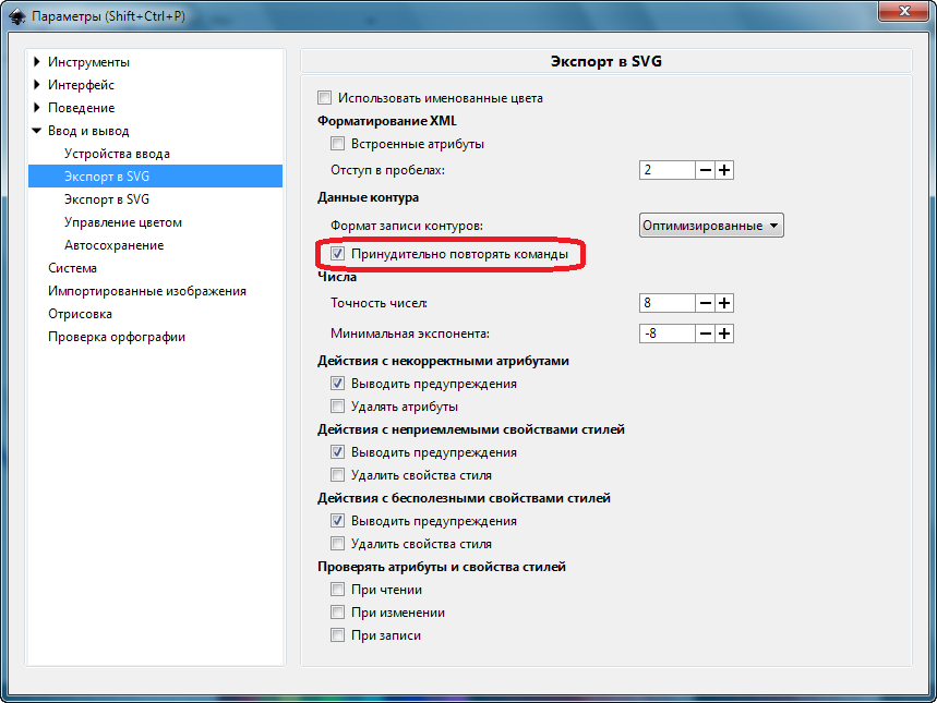 <path d="M 1,2 L 3,4 L 5,6 Z" />Чтобы InkScape использовал полный формат, заходим в Правка > Параметры... > Ввод и вывод > Экспорт в SVG и включаем опцию Данные контура > Принудительно повторять команды.
