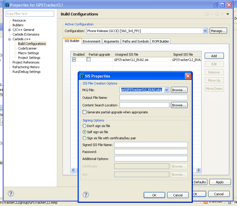 Нужно зайти в Project → Properties → Carbide.c++ → Build configurations. Выбрать в Active Configuration в выпадающем списке значение Phone release (GCCE). Во вкладке SIS Builder нажать кнопку Add. Выбрать PKG-файл, потом нажать Ok.