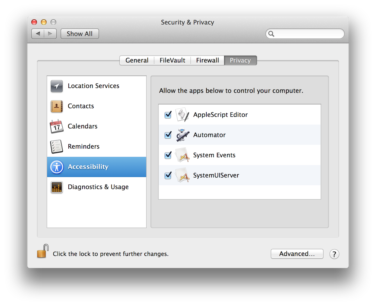 -- Checks to see if System Preferences > Universal Access > Enable access for assistive devices is checked | |