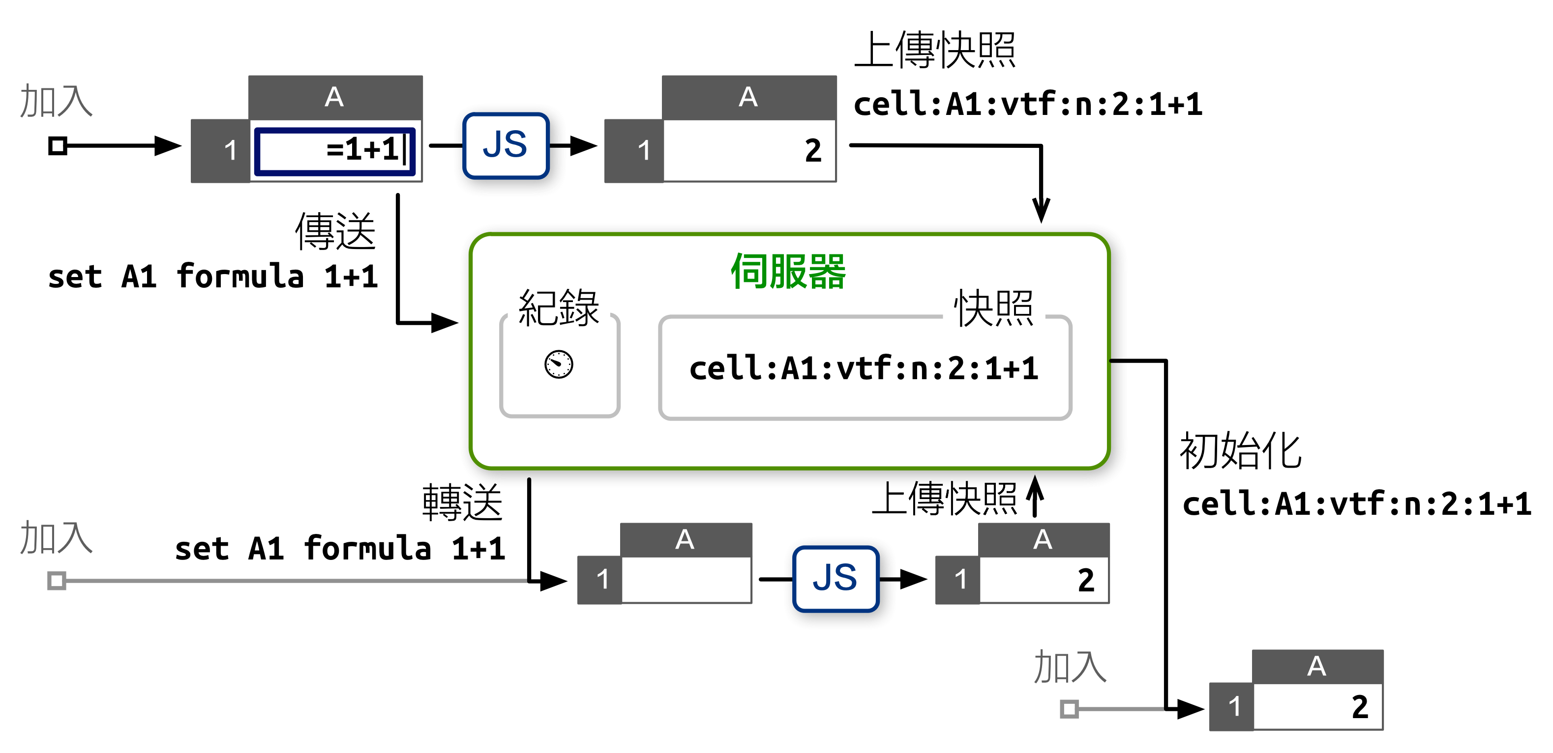 細心的讀者也許會發現,這兩個問題的癥結,都是因為伺服器缺乏執行試算表指令的能力。如果伺服器在接收到每個指令時,可以自行更新內部的試算表狀態,它其實根本不需要維護指令的積存紀錄。