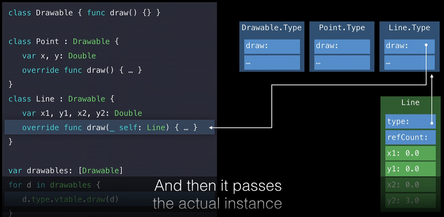 Also, whenever a struct adopt protocol, it takes part in dynamic dispatch without V-table which needs inheritance. Instead, protocol witness table is used to find the right implementation.
