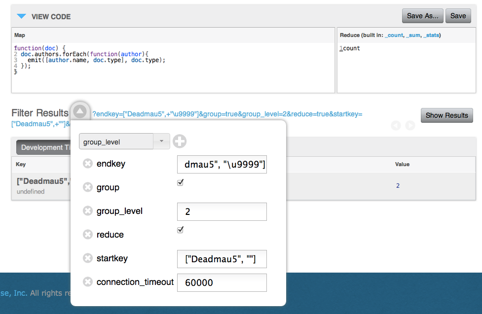 Basically I want to use this kind of map/reduce on a document structure like below to find out the number of type by each author and want to use :start_key and :end_key to get a result for a particular author.