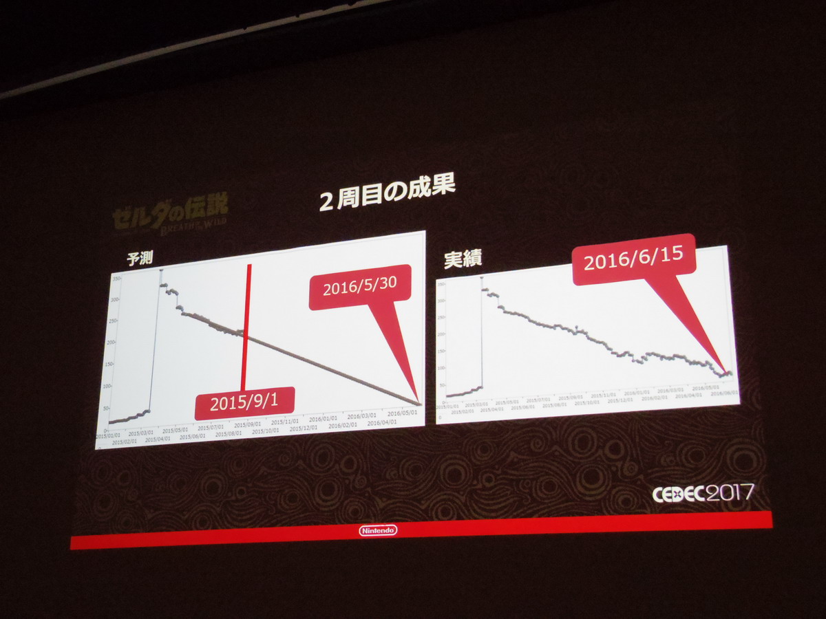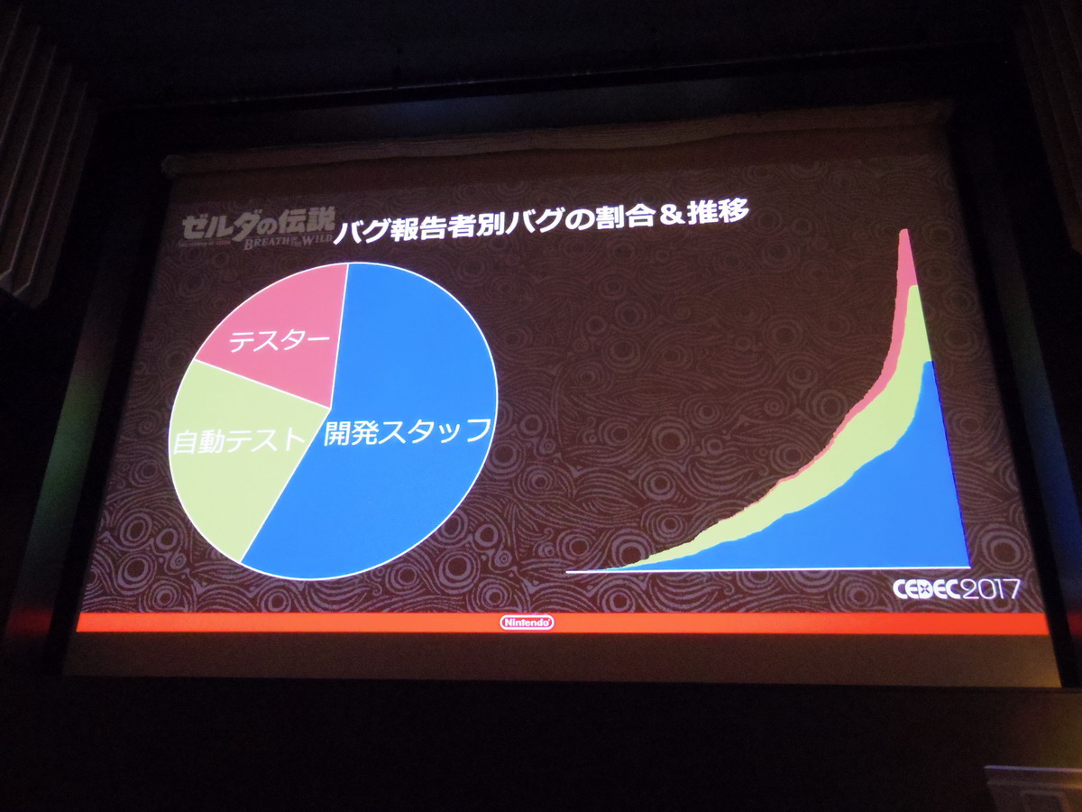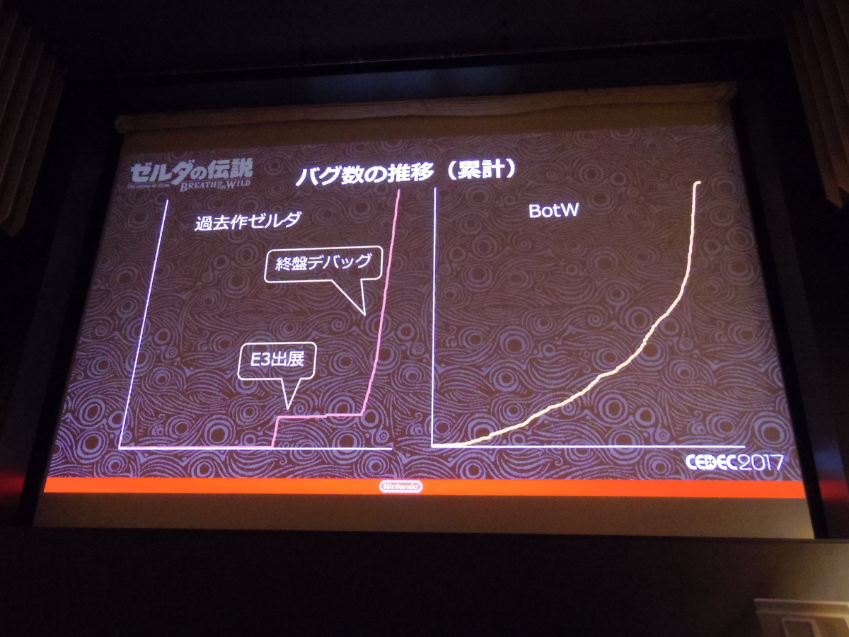 The final two images here are notable — the first showing bug count graphs for comparison. The graph on the left shows the bug count for a past Zelda title (maybe Skyward Sword?), indicating the first spike being the E3 build, and then the second spike being the final debug phase. The graph for BotW is shown on the right.