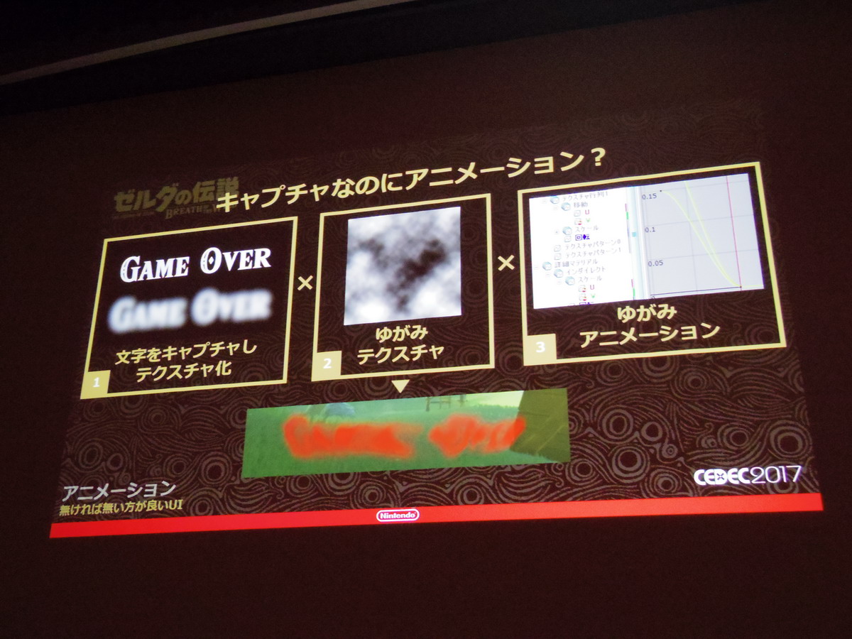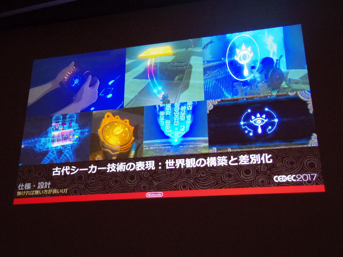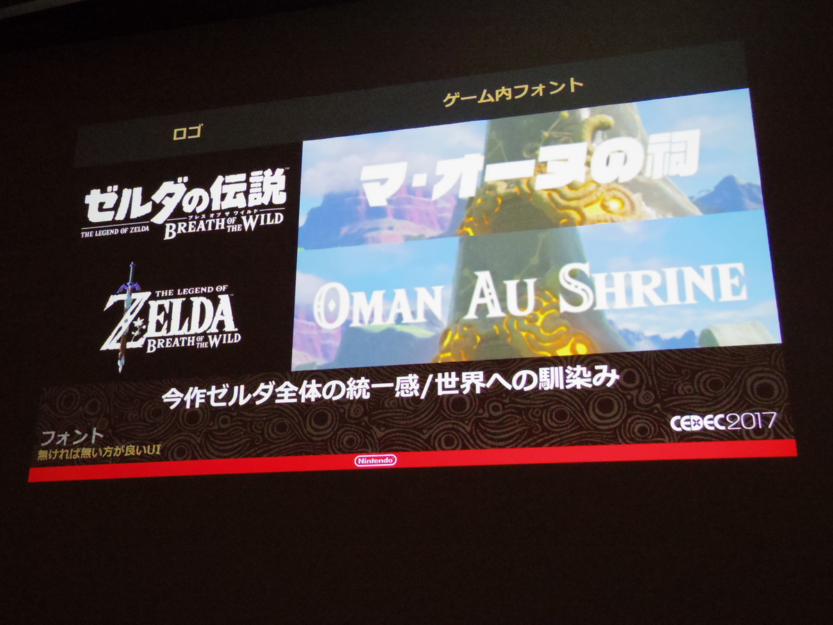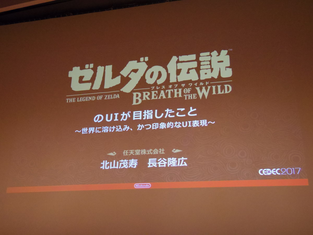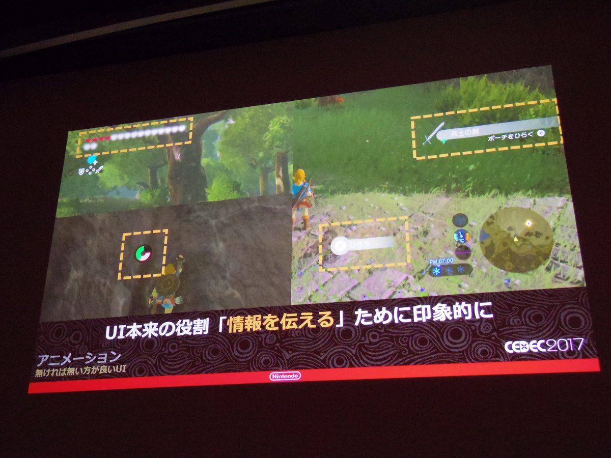 Next up is the talk, “The Aim of BotW’s UI — Immersive, Impressionable UI” (original article here. Being that their aim for BotW was to reconsider Zelda conventions from the ground up, they discussed how they achieved their goal of creating UI that is instantly recognizable as a change, but seamlessly integrates with the game world in 4 categories — graphics, font, design and animation. Their overall concept being, “only essential UI”.)