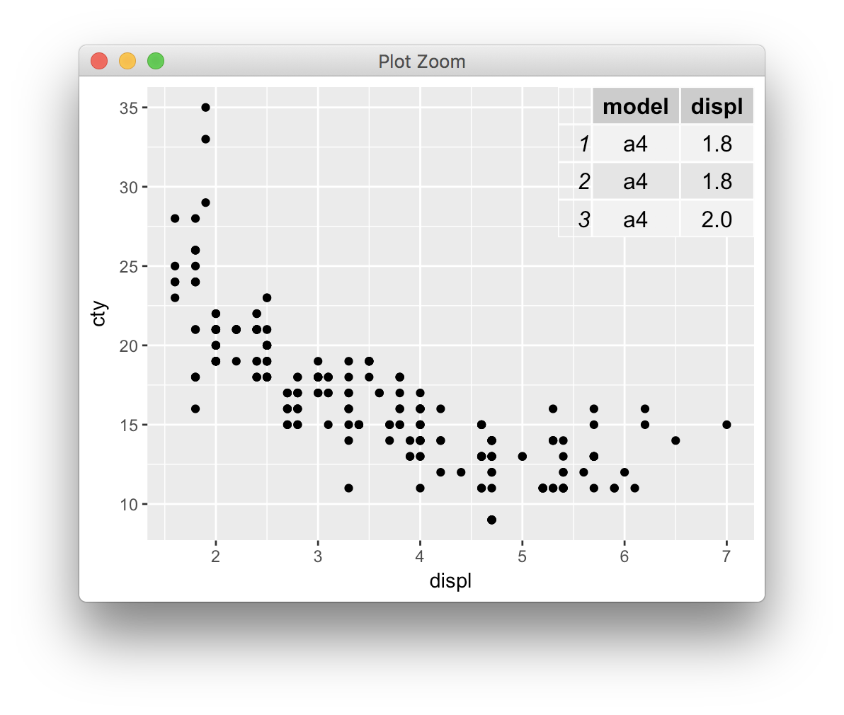 p <- ggplot(mpg, aes(displ, cty)) + geom_point() | |