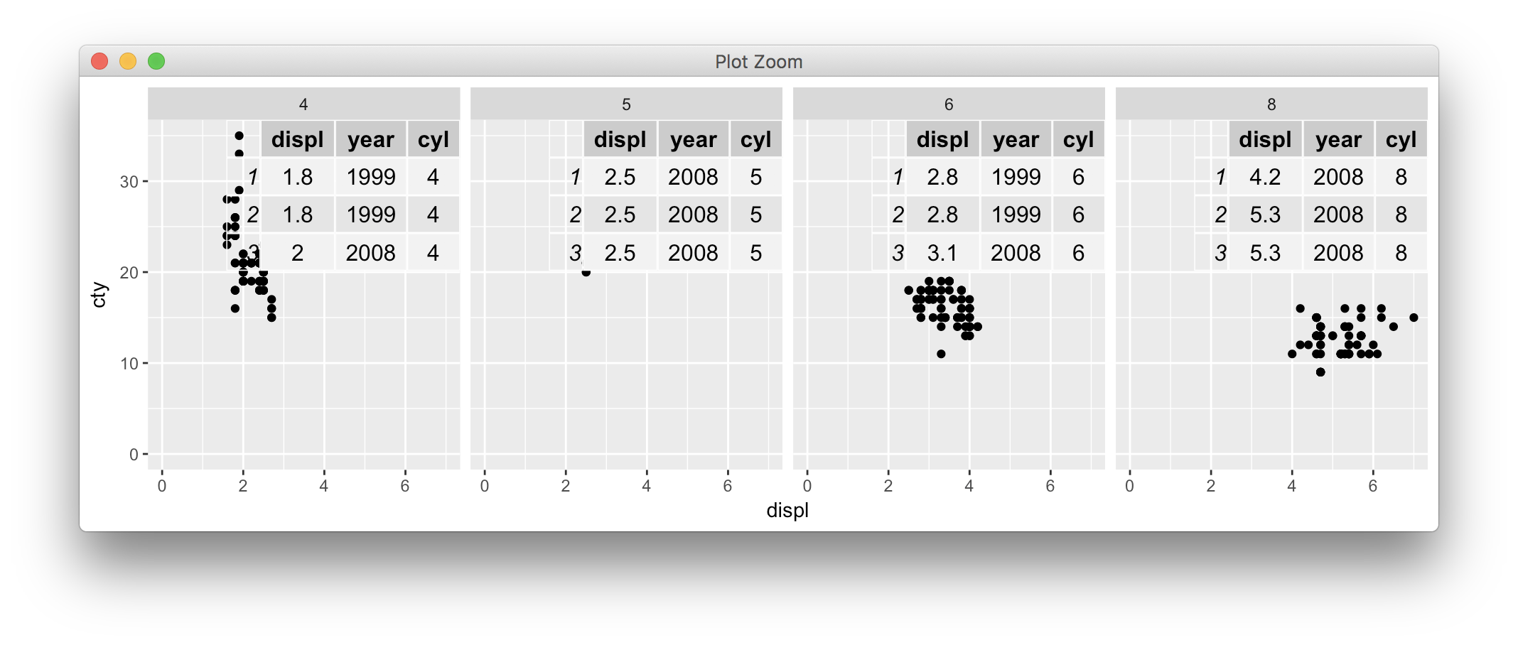 ltg <- plyr::dlply(mpg, "cyl", function(d) grobTree(justify(tableGrob(d[1:3,3:5]), "right", "top"))) | |