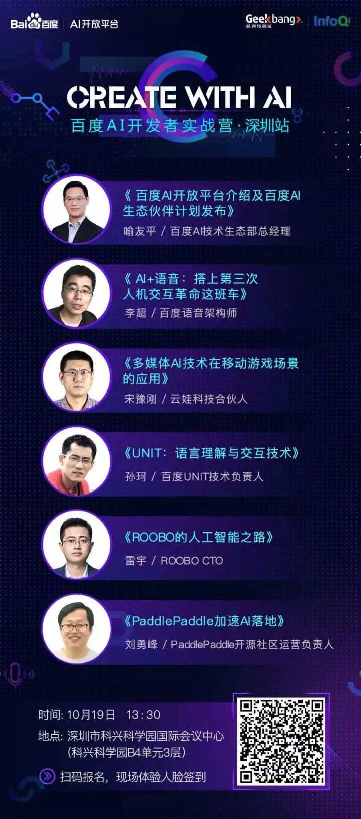 作为全国六站的第一站,“Create with AI”百度AI开发者实战营将在10月19日从深圳开营。深圳的创业环境宽松、开发者氛围浓郁,物联网、制造、科技电子等产业发展独占鳌头,百度AI开发者实战营将自身AI开放能力与深圳特色结合,呈现出一道AI盛宴。看到这里已经迫不及待的小伙伴,可以拉到文末先去报名,免费名额有限,先到先得~