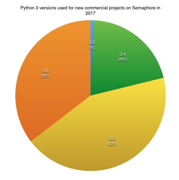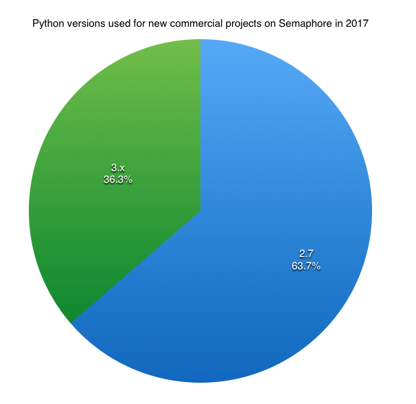 在 Semaphore 最近发布的调查结果显示,在 2017 年新的商业项目中,Python 2.7 的比例为 63.7%,Python 3.x 的版本比例达到了 36.3%,上涨 8.2%。
