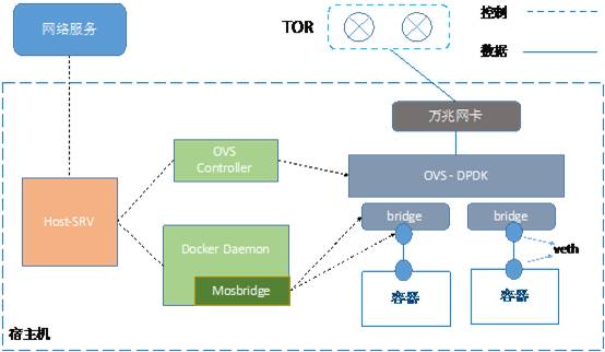 为了解决这些问题,我们基于 Libnetwork,开发了 MosBridge – 适配美团云网络架构的 Docker 网络驱动。在创建容器时,需要指定容器创建参数—net=mosbridge,并将 ip 地址,网关,OVS Bridge 等参数传给 Docker,由 MosBridge 完成网络的配置过程。有了 MosBridge,容器创建启动后便有了网络可以使用。容器的网络配置也持久化在 MosBridge 中,容器重启后网络配置也不会丢失。