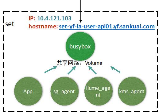 参考 Kubernetes 的 Pod 设计,针对我们的容器平台设计实现了 set 容器组。容器组对外呈现一个 IP,内置一个 busybox 作为 infra-container,它不提供任何业务功能,set 的网络、volume 都配置在 busybox 上,所有其他的容器都和 busybox 共享。