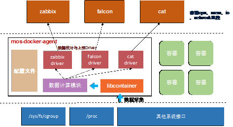针对业务和运维的监控需求,我们基于 libcontainer 开发了 mos-docker-agent 监控模块。该模块从宿主机 proc、cgroup 等接口采集容器数据,经过加工换算,再通过不同的监控系统 driver 上报数据。该模块使用 go 语言编写,既可以高效率,又可以直接使用 libcontainer。而且监控不经过 Docker Daemon,不加重 Daemon 的负担。
