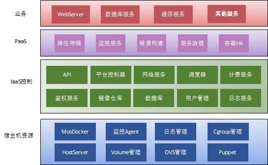 整体架构上与云计算架构是一致的,自上而下分为业务层、PaaS 层、IaaS 控制层及宿主机资源层。