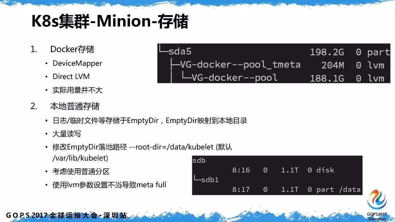 minion 节点操作系统使用的是 centos 7,docker storage 使用的 devicemapper driver,日志基本写到外挂的 EmptyDir volume,docker 存储使用得很少。