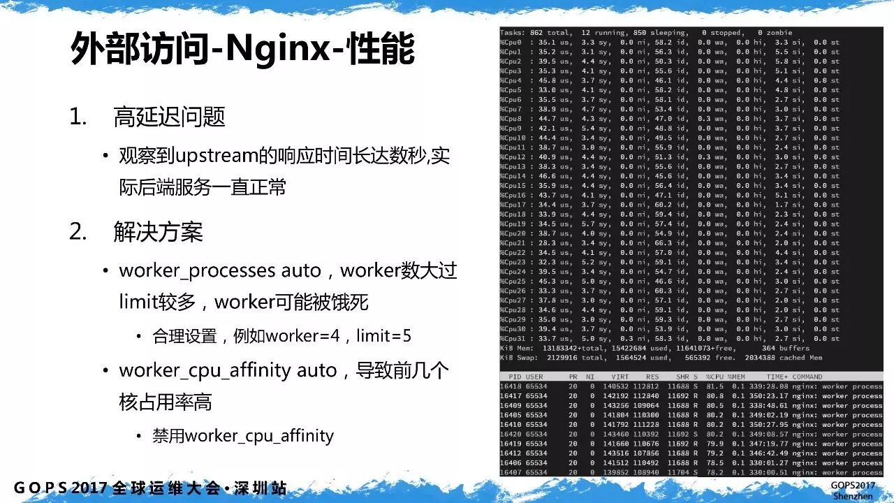 按照默认配置,一台24核 CPU 的机器上,对于一个业务的 nginx,自动配置为 24个 worker 进程,而 cpu limit 往往只设置成 5、6个核,worker 没有 cpu 资源导致高延迟。同时,调整 worker 进程的亲和性,防止压力堆积在前几个核上。