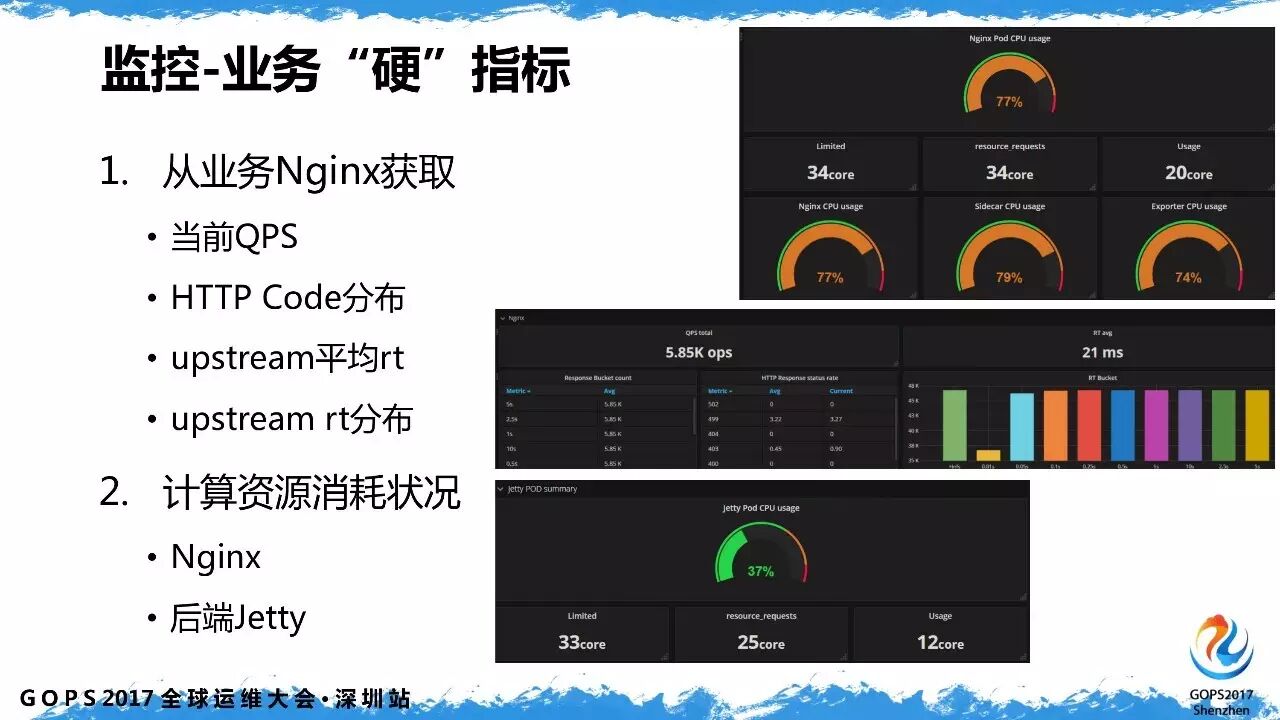 监控指标包括两个方面,一个是硬指标,例如,从 nginx 获取当前业务的 qps、http code 分布、当前整个业务的资源消耗情况以及后端的 jetty 消耗情况。