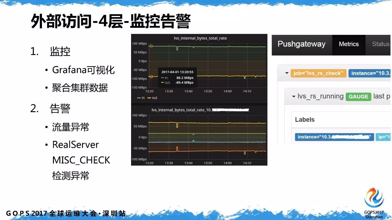 我们对 LVS 控制程序做了改造,暴露了一些指标,包括网络和应用服务相关的数据,并以此实现了 Grafana 可视化和监控告警。
