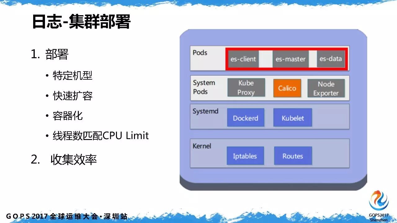 日志的处理是收集到 elasticsearch 处理的。ES 的部署和 prometheus 类似也是 POD 的方式。部署 ES 的 datanode、master 和 client 需要关注线程数据和 CPU limit 的匹配问题。
