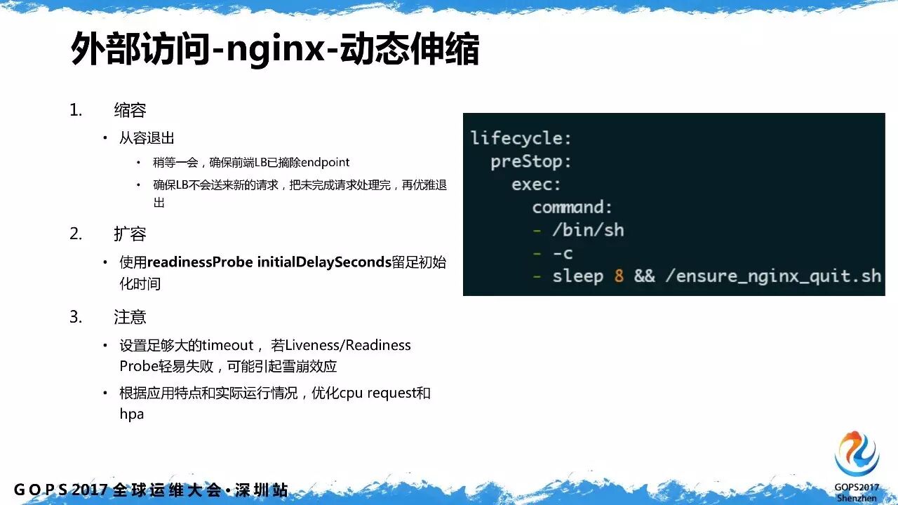 Nginx 动态缩容需考虑柔性,比如某业务原来有3个 Nginx 容器,现在要缩成2个,被停掉这个 Nginx 容器需要做一些优雅退出的准备工作,否则可能导致服务整体响应延迟陡增。
