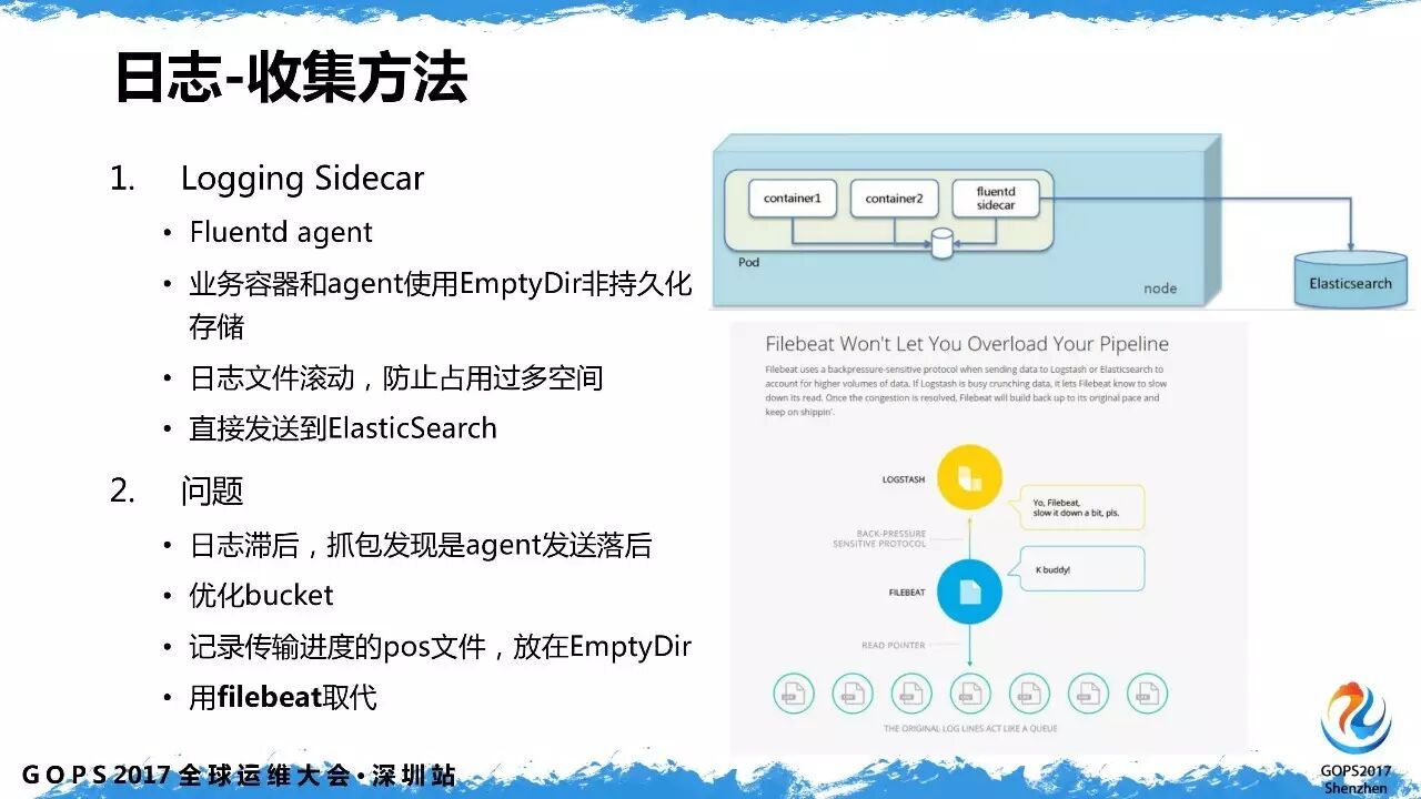 日志收集容器试过使用 fluentd 进行收集,与业务容器共享一个存储,发现有日志滞后和资源消耗高的问题。用 filebeat 容器替代 fluentd 之后,资源占用率很小,消耗不到0.1核、内存不到 100M 就可以实现比较好的日志传输效果。