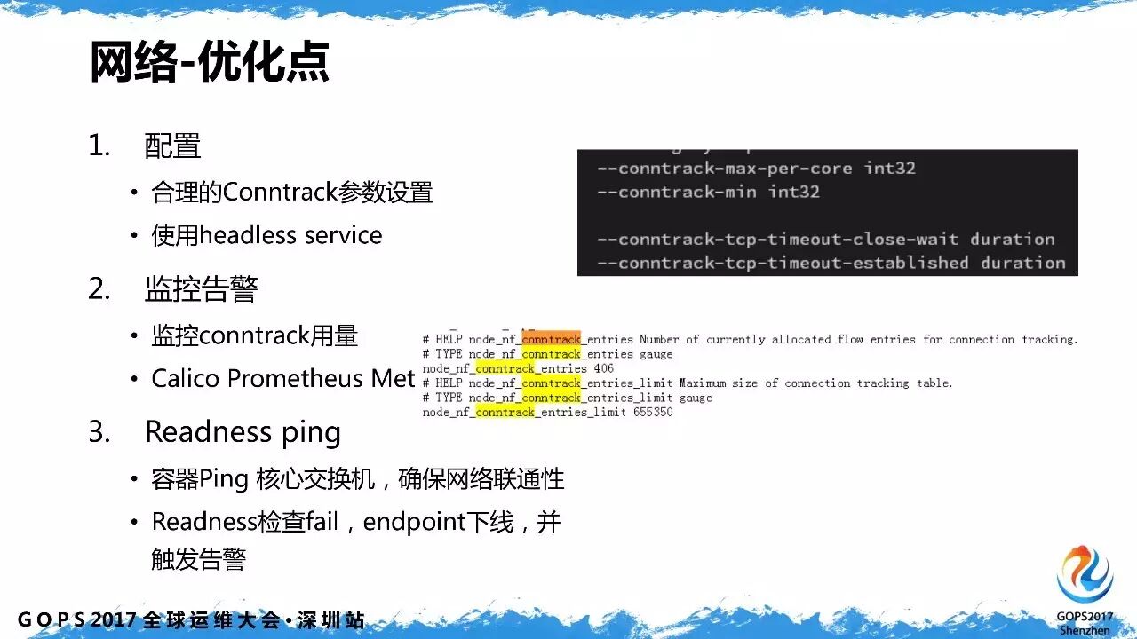 优化主要是针对 conntrack,建议尽量使用 headless service,少产生 iptables rule。同时,对 conntrack 用量进行监控。容错方面,容器会主动去 ping 交换机,确保网络的连通性。当 calico 出现问题的时候,容器是不会加入服务的,由此来保证服务的可靠性。