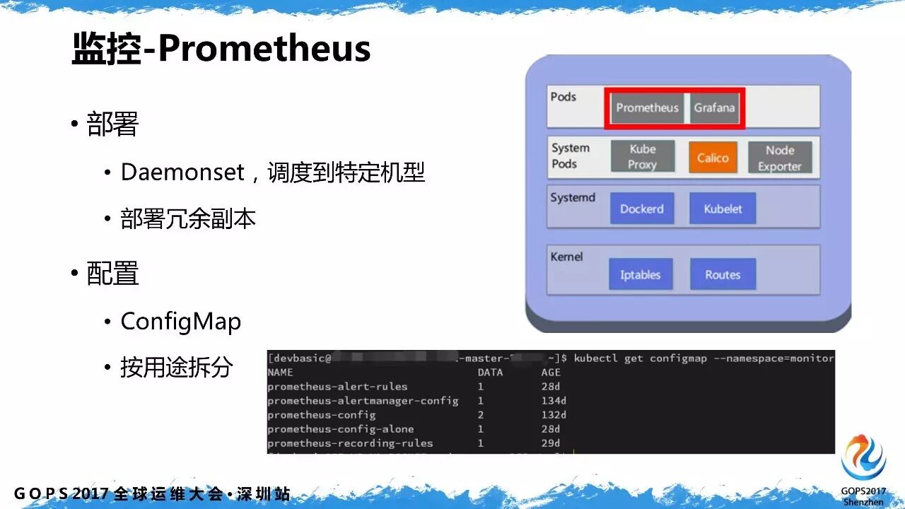 监控采用的是 prometheus,开箱即用的整体方案。部署方面是在 k8s 上部署成 Daemonsets 或者 Deployment,针对其特点会调度到特定的机型,通过类型拆分成几种 map 来方便管理。