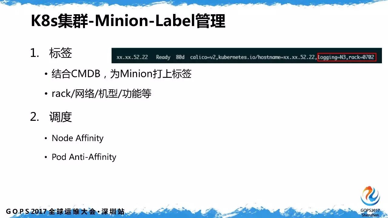 考虑到和 CMDB 的结合,minion 节点打上了 Label,例如标记它的功能是什么,物理位置信息,机柜等。这些信息对于 Pod 调度非常重要。包括 Pod 的 Node 亲和性,Pod 亲和性和反亲和性。