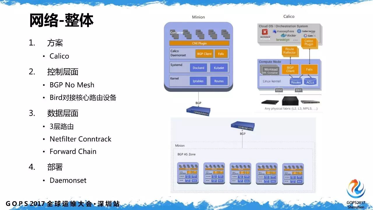 容器网络的方面我们采用的是 calico 的方案。主机通过 BGP 直接和核心路由设备对接,这里也可以用 RouteReflector 替代。