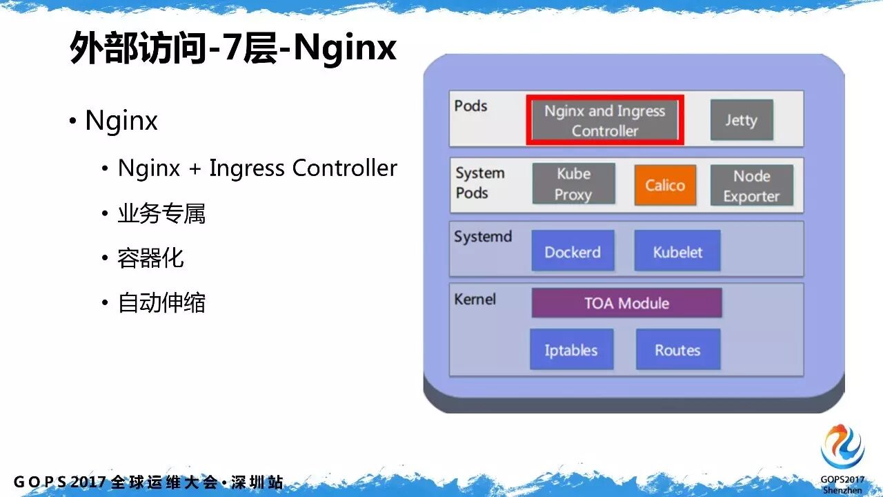 七层负载均衡采用的是 POD 里面跑 nginx+ingress controller,它的定位是业务专属的反向代理,能够实现自动扩缩容,面向的 upstream 主要是 Jetty 业务容器。