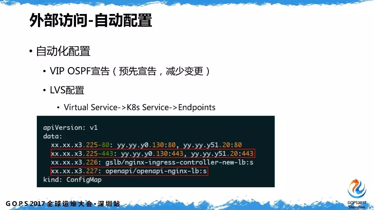 对于4层负载均衡的配置,是通过自动化方式来实现的,无需人工配置,可以自动在路由设备宣告 vip,并生成对应的 ECMP 路由。LVS 的 VirtualServer 配置也是自动生成的,VirtualServer 到 EndPoint ip 的自动映射。
