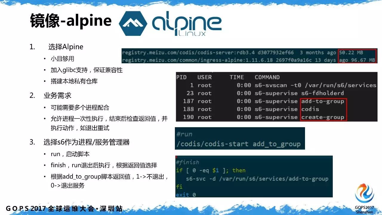 对于镜像的选择我们的原则就是够小、够用,为了保证兼容性我们加入 glibc 支持。Docker 其实推荐只跑一个进程,但很多业务都是需要多个进程配合的,S6 用于应对这种场景,作为进程和服务的管理器来实现一些比较复杂的功能。