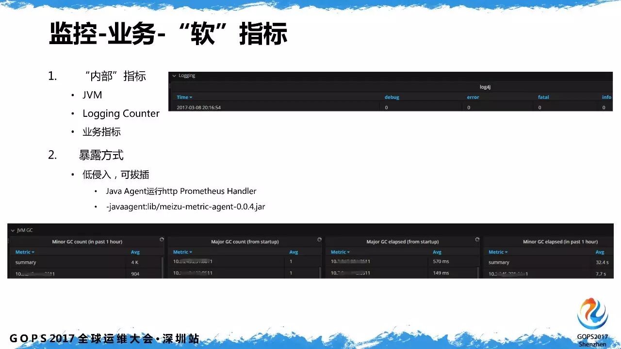 另一方面是业务的软指标,指的是内部指标,主要包括 jvm 的指标,内部的 logger 相关,如 error 计数器。