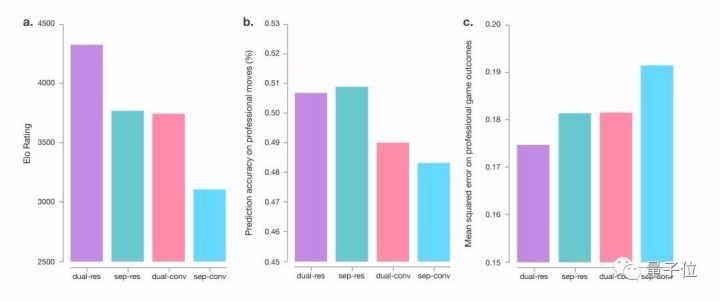 Julian Schrittwieser:主要是因为改进了价值/策略网络,训练和架构都变得更好了,不同的网络架构之间的对比如下图所示: