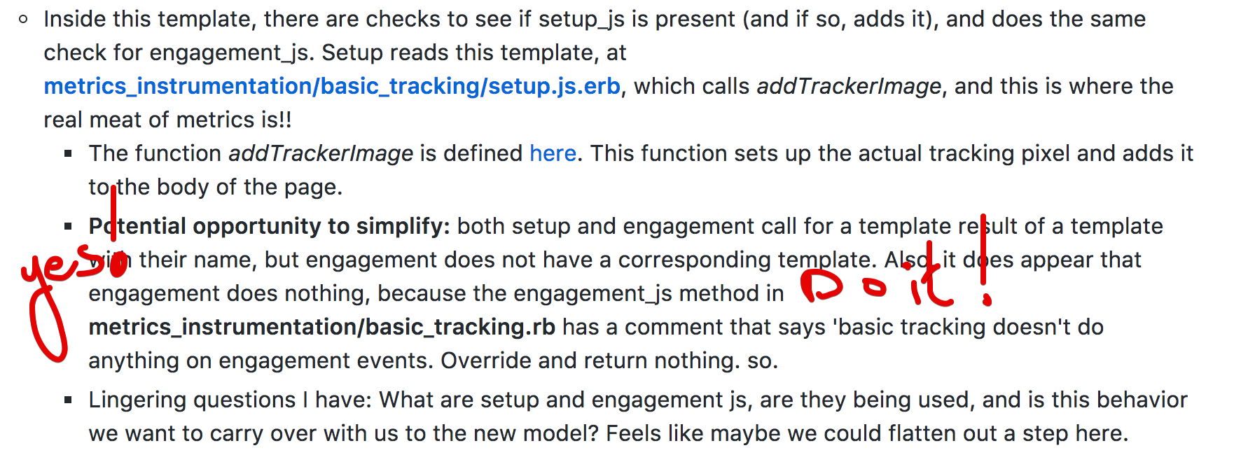 - Inside this template, there are checks to see if setup_js is present (and if so, adds it), and does the same check for engagement_js. Setup reads this template, at metrics_instrumentation/basic_tracking/setup.js.erb, which calls addTrackerImage, and this is where the real meat of metrics is!!
