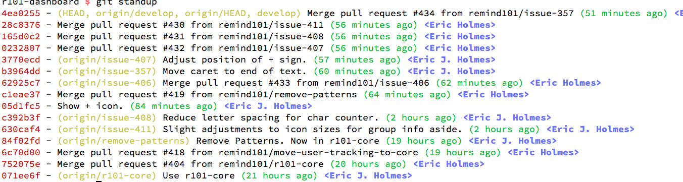 | ; Get a summary of yesterday commits. Useful for Scrum standup. | |