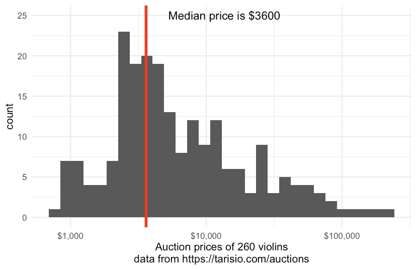 | xlab(str_glue('Auction prices of {nrow(tarisio_com_auctions_prices)} violins\n data from https://tarisio.com/auctions')) | |