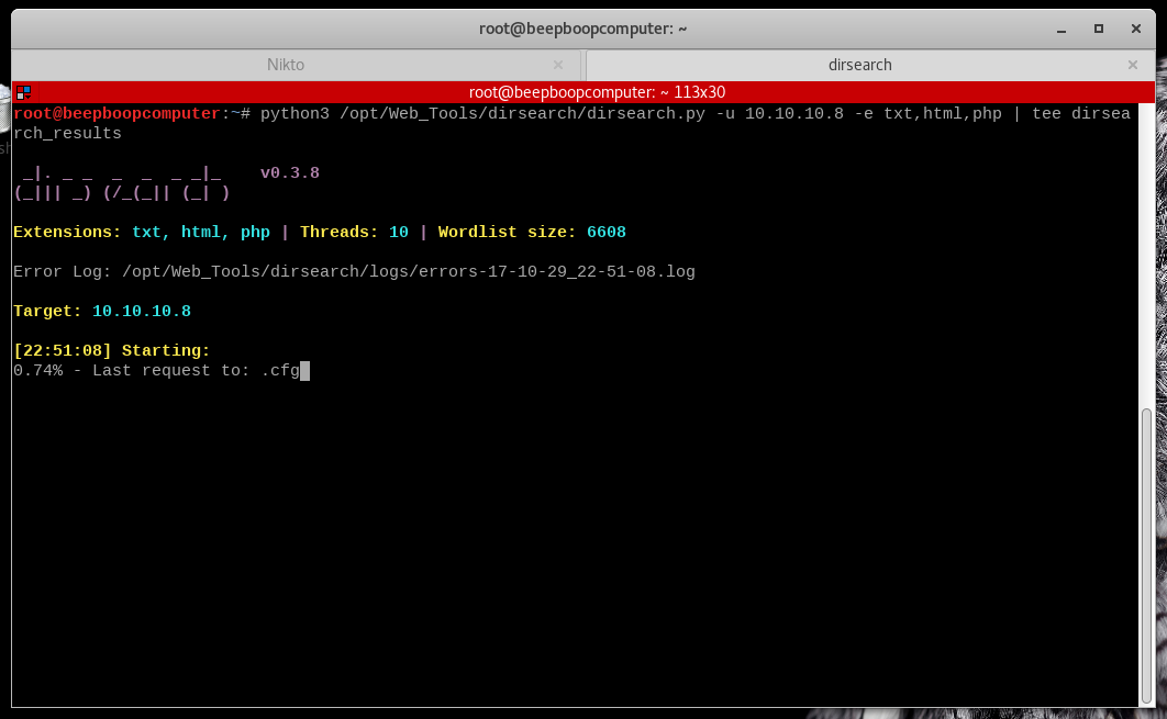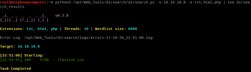 run python3 (PATH)/dirsearch.py -u http://10.10.10.8 -e txt,html,php | tee dirsearch_results