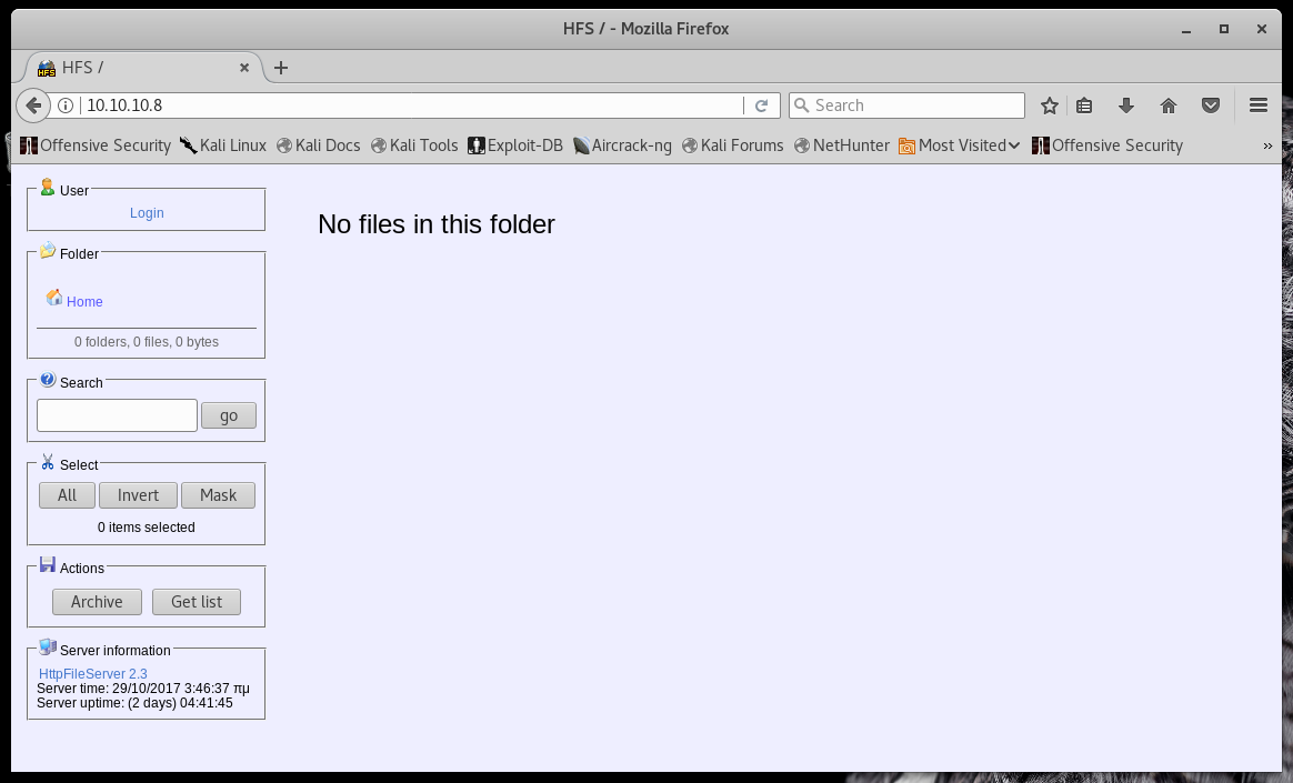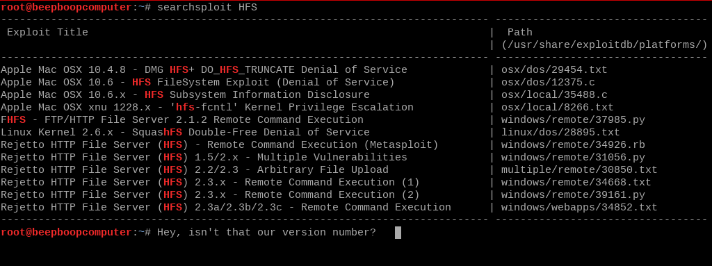 Hmm, no luck there. Nikto did refer to it as "HFS," however, so we can try that as well.