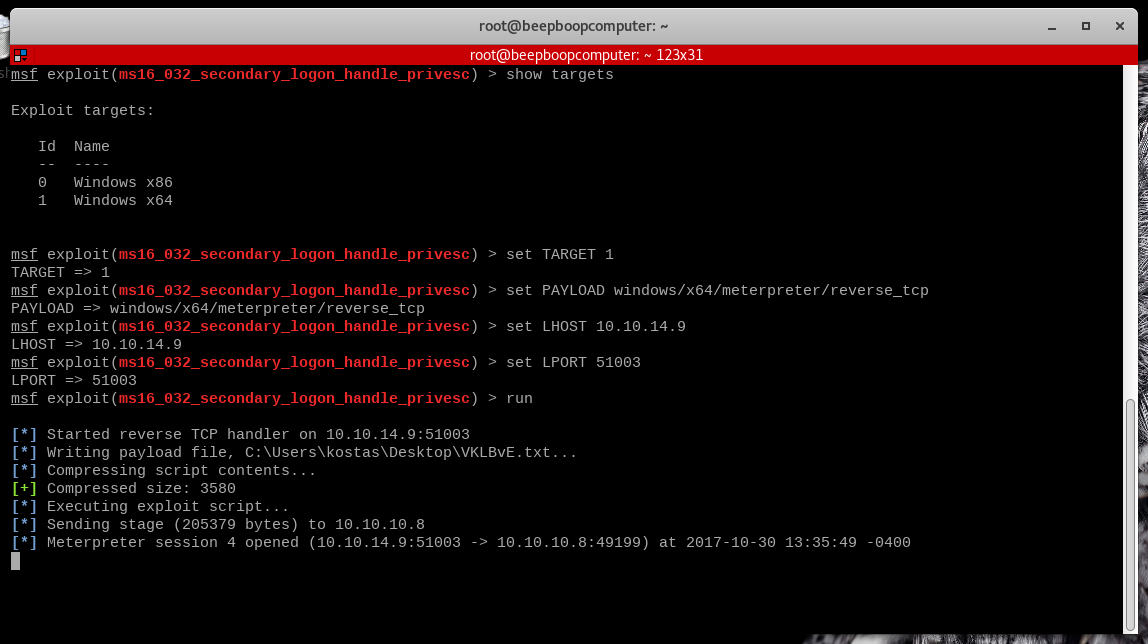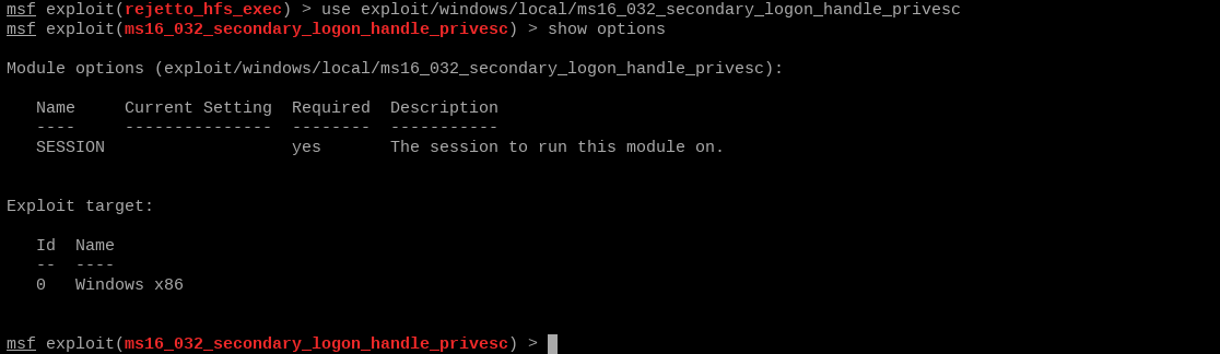 use exploit/windows/local/ms16_032_secondary_logon_handle_privescshow optionsto see what parameters we need to set