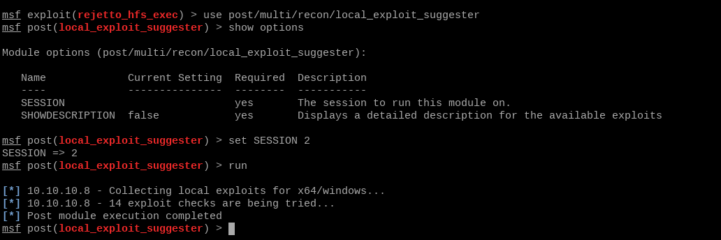use post/multi/recon/local_exploit_suggesterset SESSION 2to point the exploit at our x64 meterpreter session- Optionally, run