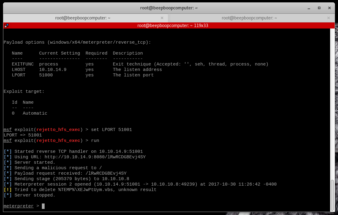 Since we have the other meterpreter still running, we need to set the LPORT again.