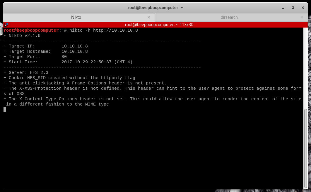 Run nikto -h http://10.10.10.8 and open up a new terminal window or tab for our next tool.